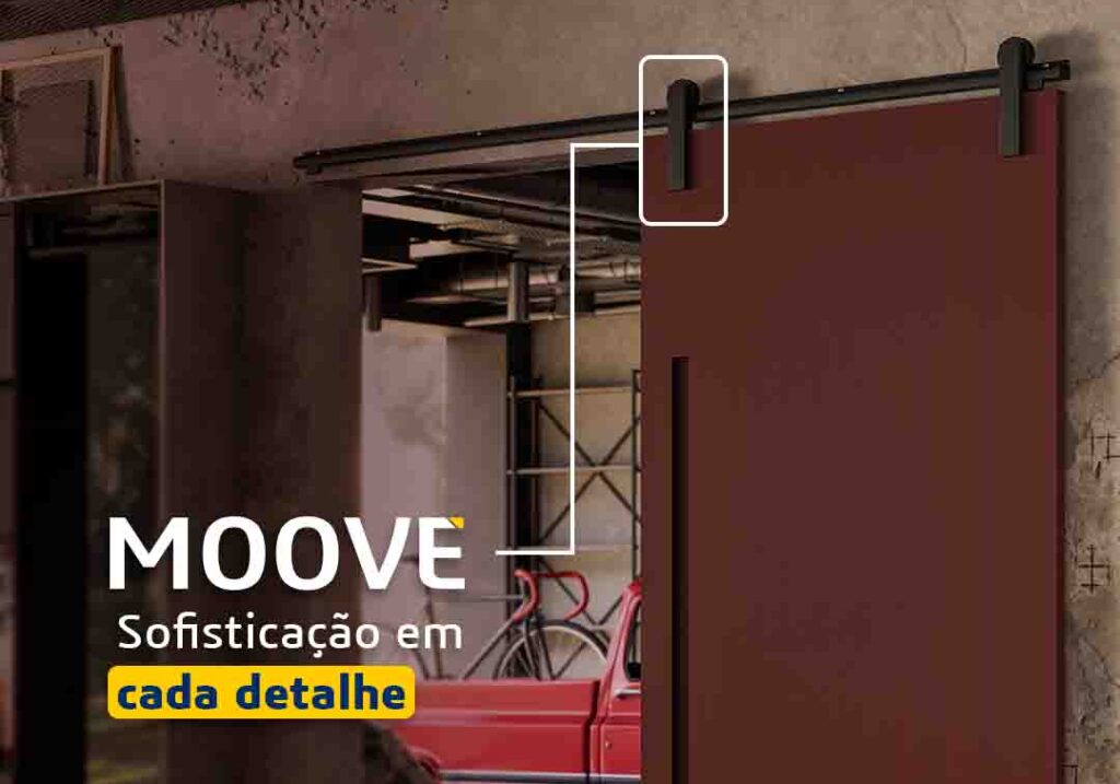 Atendendo as necessidades do mercado, criamos o Moove, um sistema aparente completo: capa protetora, guia de rasgo duas rodas, batente inferior, tope com tampa e todos os parafusos e buchas necessários.